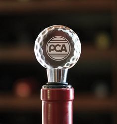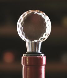 Golf Ball Bottle Stopper. Optical crystal. Stainless steel/rubber seal. Hand cut and polished dimples.