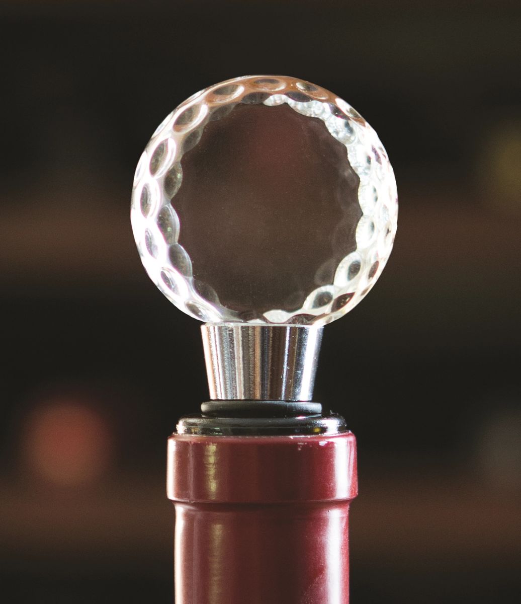 Additional InformationGolf Ball Bottle Stopper. Optical crystal. Stainless steel/rubber seal. Hand cut and polished dimples.